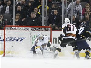 Walleye goalie Carter Hutton stands up after Cincinnati Cyclones player Mathiew Aubin, 9, scores a goal during the first period.