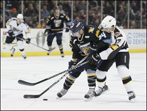 The Walleye's Christopher DiDoenico, 24, tries to skate the puck past Cincinnati Cyclones payer Mike Liambas, 17.