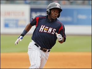Timo Perez runs to third on a double by Ryan Strieby in the fifth inning. Perez had three hits, including a solo home run, and three RBIs in the game.