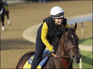 Exercise rider Carlos Rosas takes Kentucky Derby entrant Nehro for a workout at Churchill Downs.