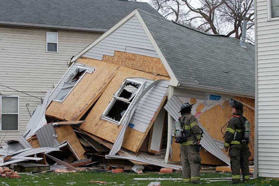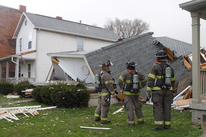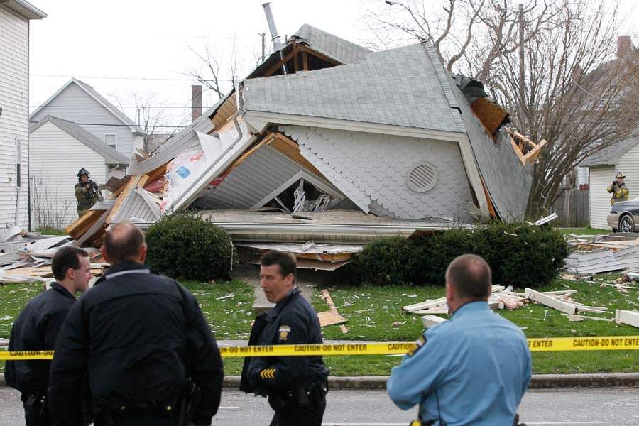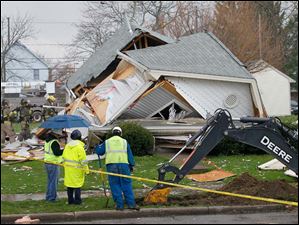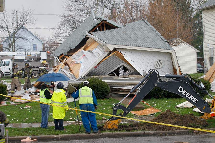Columbia Gas workers search for gas shut off valve following a house collapse and possible explosion in the 1400 block of North Huron Street.