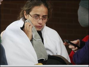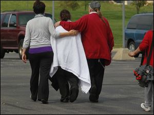 Anna Angel, center, the mother of the five children that were killed in addition to Miss Angel's boyfriend, is comforted by her mother Linda Ramirez, right, and cousin Amy Welly, left, while coming out of Mercy Hospital in Tiffin.