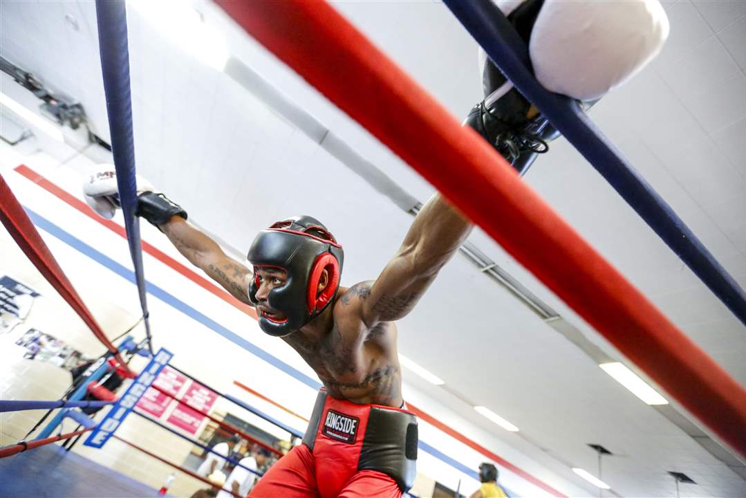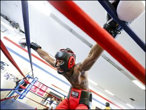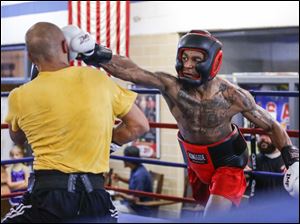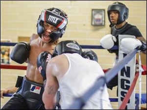 Angelo Snow, right, connects with a right while sparring with Jeremy Caughhorn.