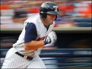 Mud Hens right fielder Tyler Collins races towards first base after connecting with the ball, but is tagged ou.