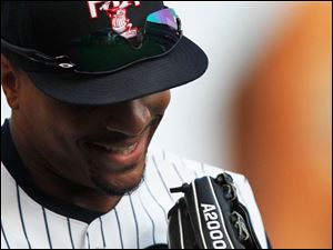 Toledo short stop Hernan Perez slices the ball into the air.