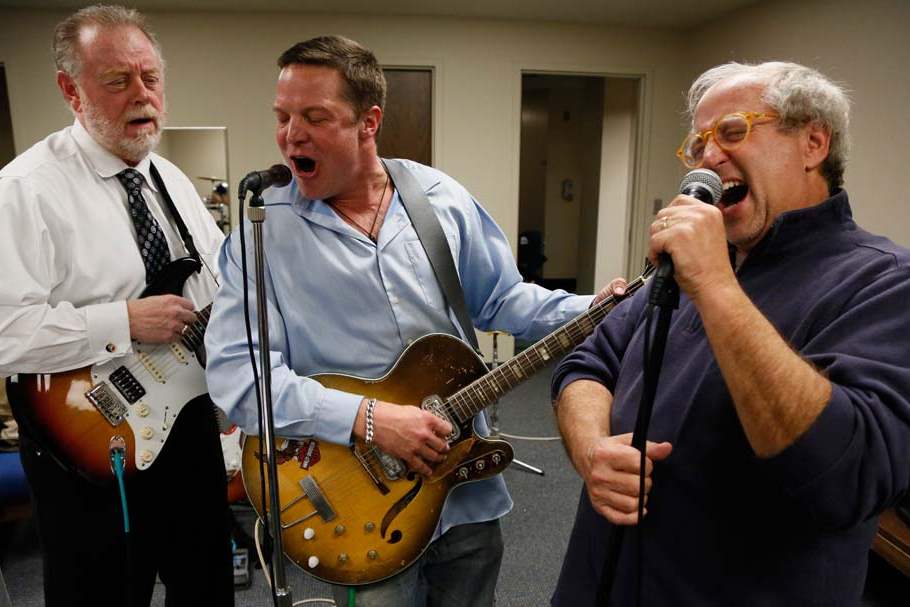 Left to right Marty Mohler, Jim Anderson, and Scott Schwab of Jingle Balls, a rock band comprised almost exclusively of members of the local bar and bench, as well as court and clerk employees, rehearse.