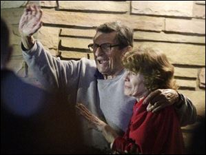 Former Penn State Coach Joe Paterno and his wife, Sue Paterno, stand on their porch to thank supporters gathered outside their home in State College, Pa. Nov. 9, 2011.