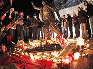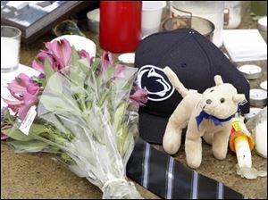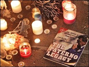 Candles and memorabilia are placed by well wishers at the foot of a statue of Joe Paterno outside Beaver Stadium on the Penn State University campus Saturday.