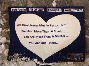 David Marselles, a senior at Penn State from Allentown, Pa., stands with a cardboard cutout of Joe Paterno near a statue of Paterno outside Beaver Stadium on the Penn State University campus Saturday in State College, Pa., after Paterno's doctors said the former coach's condition has become 'serious' after he experienced complications from lung cancer in recent days.
