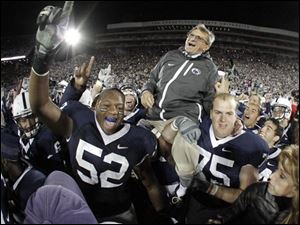 Penn State coach Joe Paterno is carried off the field by his players after getting his 400th collegiate win after their 38-21 victory over Northwestern in an NCAA college football game Nov. 6, 2010, in State College, Pa.