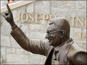 A statue of Joe Paterno stands outside Beaver Stadium on the Penn State University campus.