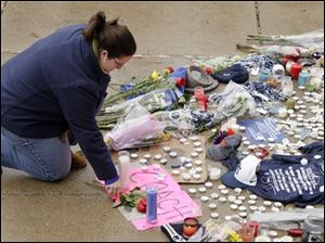 Laura Scott of State College, Pa., places a rose at the foot of a statue of Joe Paterno outside Beaver Stadium on the Penn State University campus after learning of his death Sunday in State College,Pa.