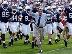 Penn State coach Joe Paterno leads his team onto the field before an NCAA college football game against Akron Sept. 4, 2004, in State College, Pa.