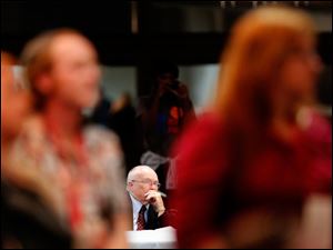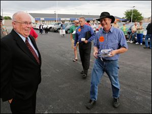 Bill Delaney, candidate for chairman of the Lucas County Republican Party, talks with John McAvoy.