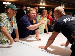 Dennis Lange argues with security before being thrown out of the Lucas County Republican Party Central Committee meeting.