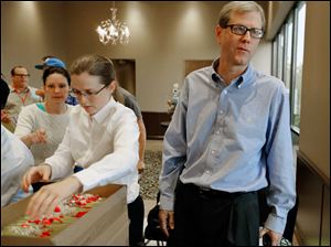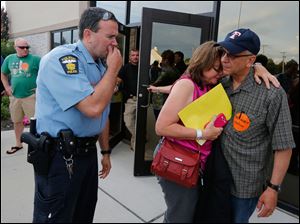 Tom Skaff tends to his wife Diana Skaff, central committee member, after she was injured by security while being thrown out of the Lucas County Republican Party Central Committee meeting.