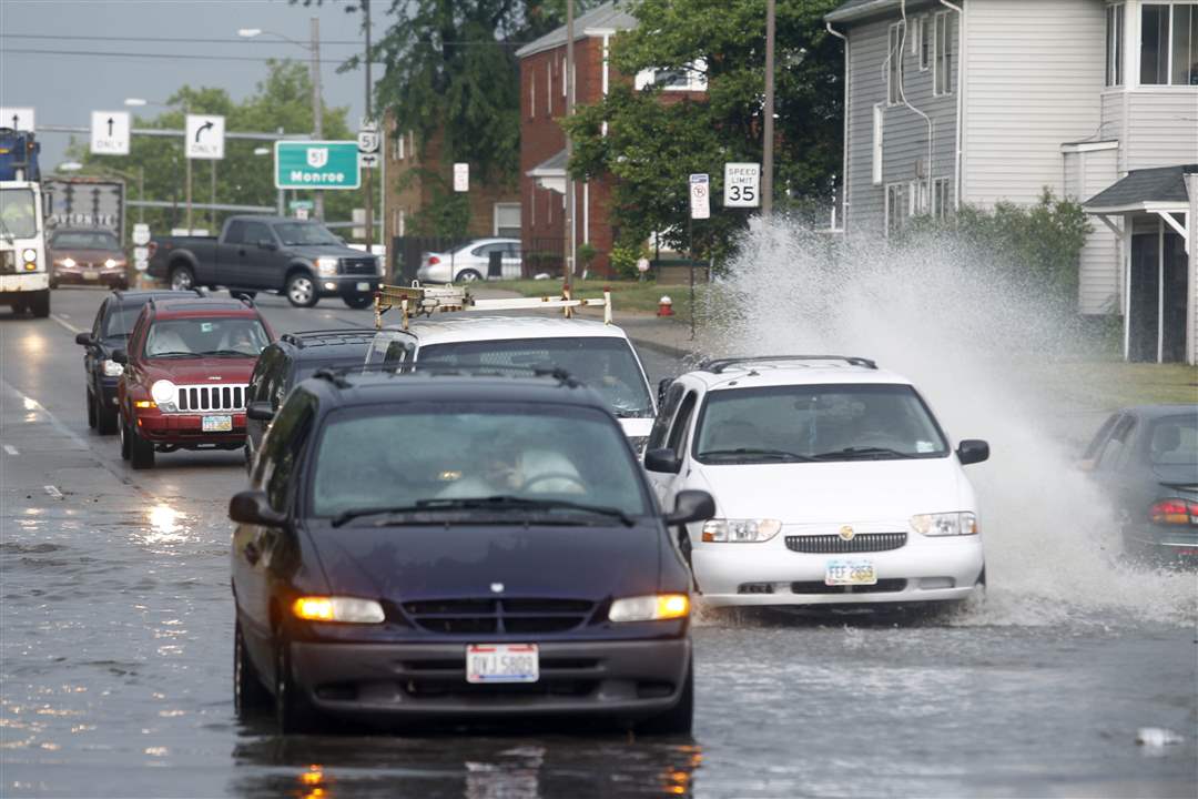 Traffic makes its way around a van stuck in flood water on Central Avenue past Monroe Street after a downpour.