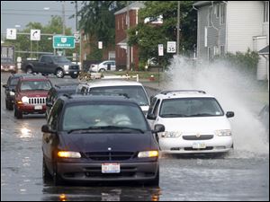 A parked car on Powhattan Parkway is surrounded by water after a downpour.