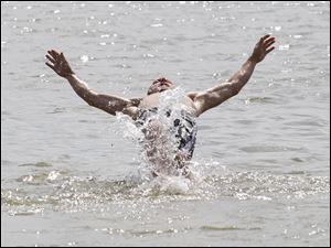 Aaron Imber, of Toledo, falls back into the water on a scorching day at Maumee Bay State Park.