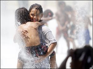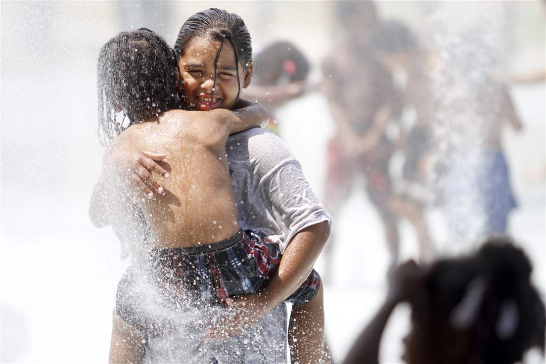 Terriona Grainger, 10, holds her cousin D.J. Morris, 4, as they cool off in the water at Savage Splash Pad.