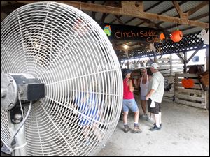 A huge fan blows on fair goers in the "Cinch & Saddle Club" barn during the Ottawa County Fair.