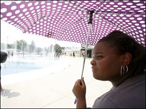 Daycare worker Tylesha Armstrong shelters under an umbrella while keeping an eye on her young charges at Savage Splash Pad.