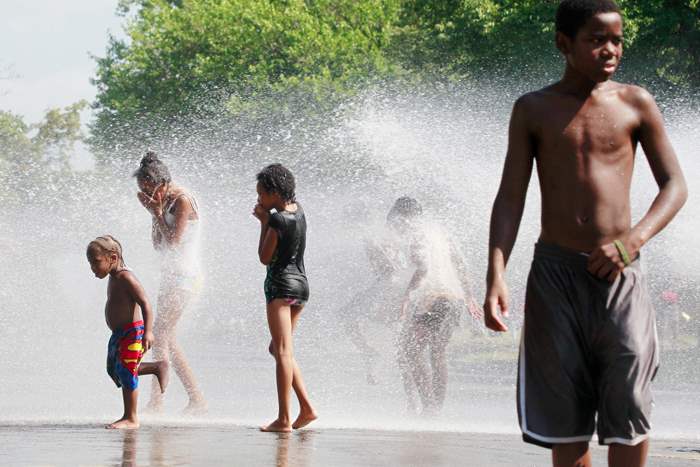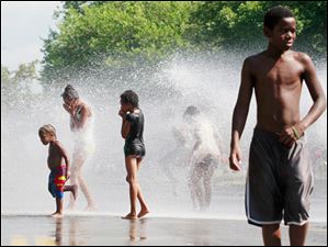 Kids off in the water from a fire hydrant at the intersection of Walnut and Michigan streets in Toledo.