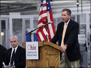 Ohio Gov. John Kasich, right, and Sen.Mark Wagoner, left, listen as Rep. Teresa Fedor speaks.