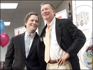 Kasich, left, pust his arm around Rep. Teresa Fedor as she speaks to supporters.