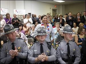 Dr. Celia Williamson, center with flowers, from the University of Toledo who formed the Lucas County Human Trafficking Coalition, gets applauds for her efforts before Ohio Gov. John Kasich signs the human trafficking bill.