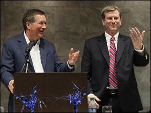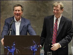 Ohio Governor John Kasich, left, jokes with Lucas County Republican Party Chairman Jon Stainbrook.