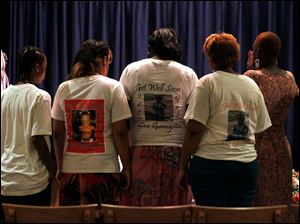Mourners, including Tamatha Hamilton, right, aunt of Keondra Hooks, 1, pay their respects during services for her at Tate Funeral Service, Thursday. The little girl died after being shot inside Moody Manor last week. The Blade/Andy Morrison