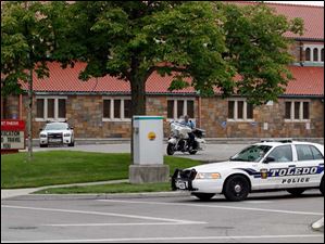 Toledo Police officers patrol the area near Tate Funeral Services in North Toledo during a funeral for Keondra Hooks.