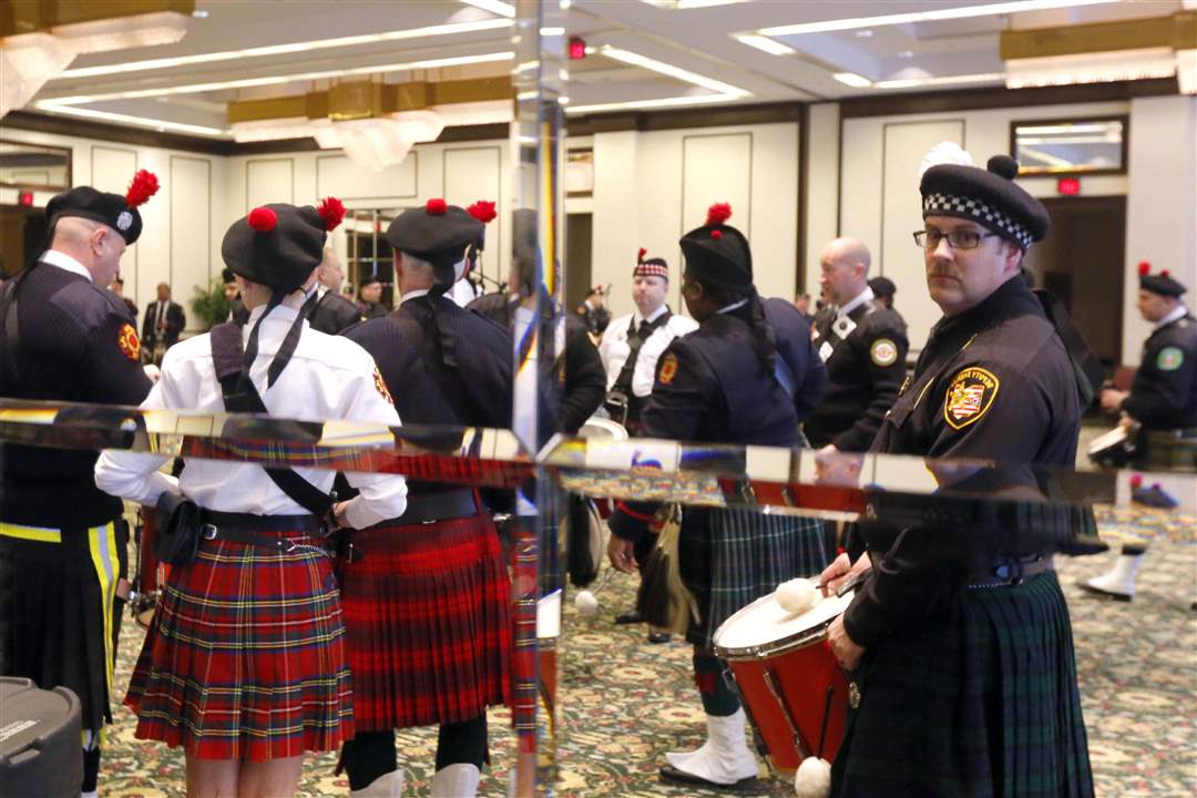 Marcus Sautter, right, with the Sylvania Township Fire Department, watches as members of pipes and drum corps make their way to the SeaGate Convention Centre.