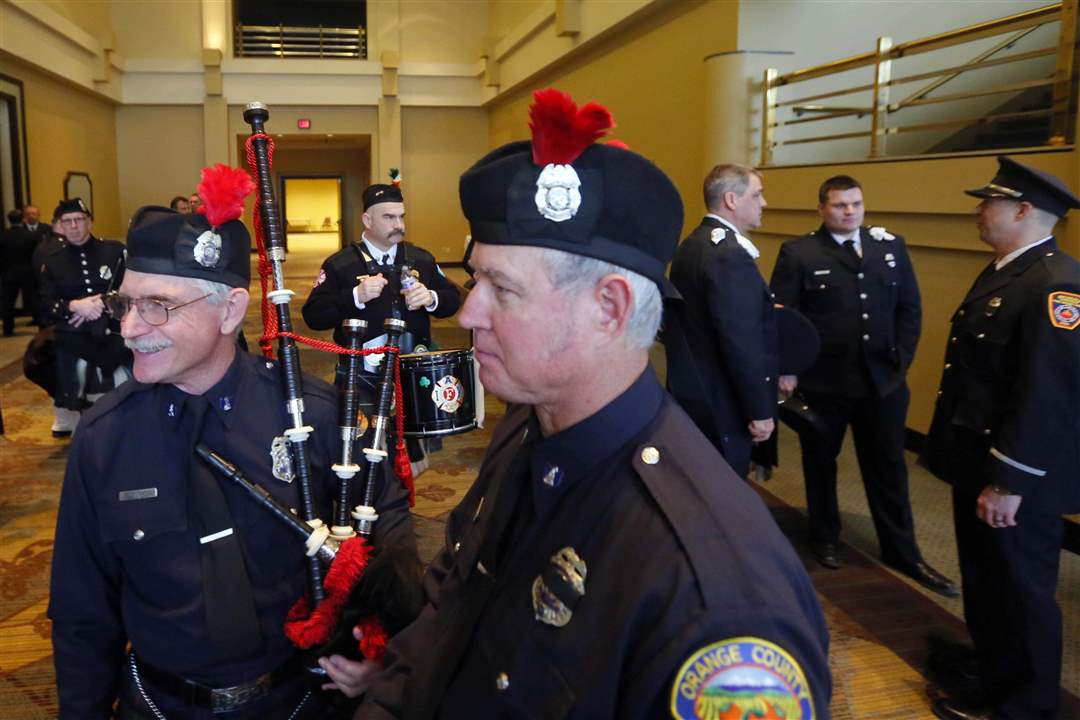 Ralph Bates, left, and Kem Murray, right, with The Orange County Fire Authority Pipes & Drums, get ready to play at the Last Alarm service.