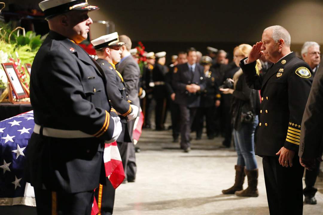 Toledo Fire Chief Luis Santiago salutes the casket of firefighter James Dickman during the Last Alarm funeral service.