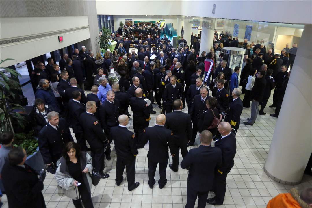 Firefighters and their families fill the lobby of the SeaGate Convention Center in Toledo before the doors open for the Last Alarm funeral service.