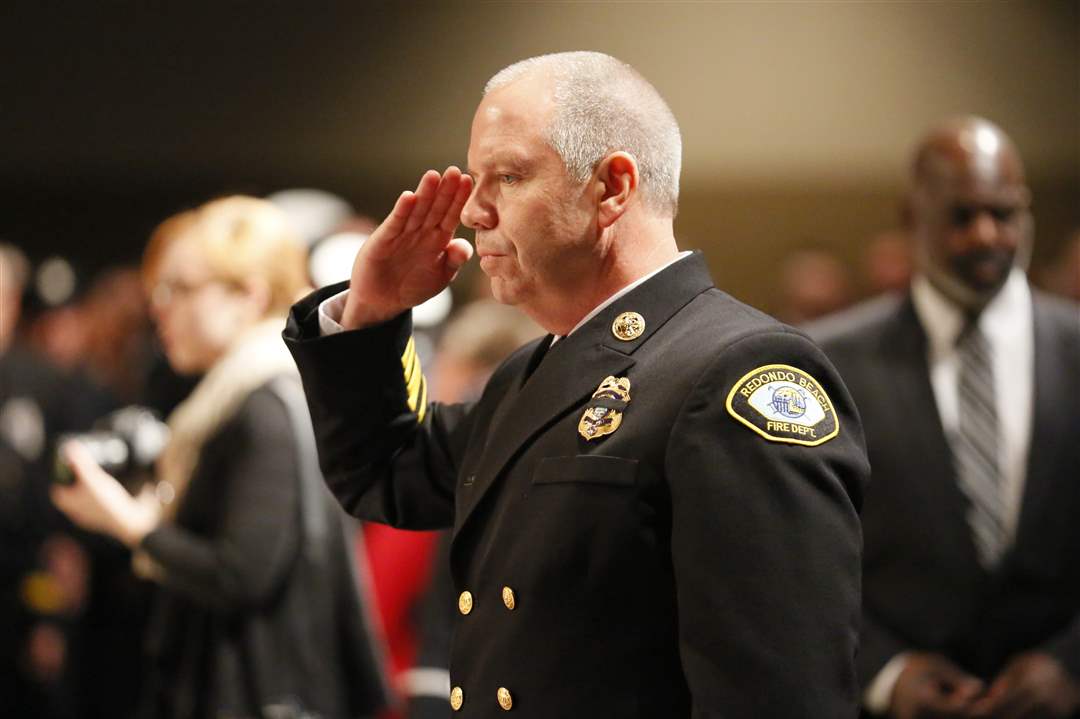 Chief Robert Metzger of the Redondo Beach, Calif., Fire Department salutes the casket of James Dickman.