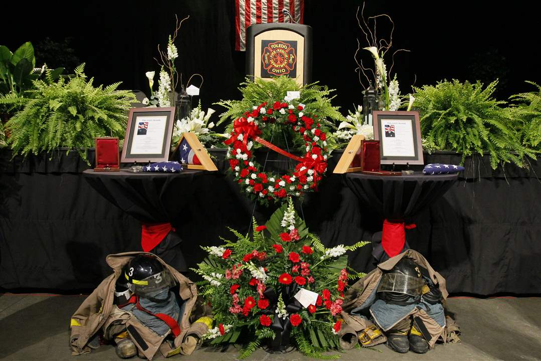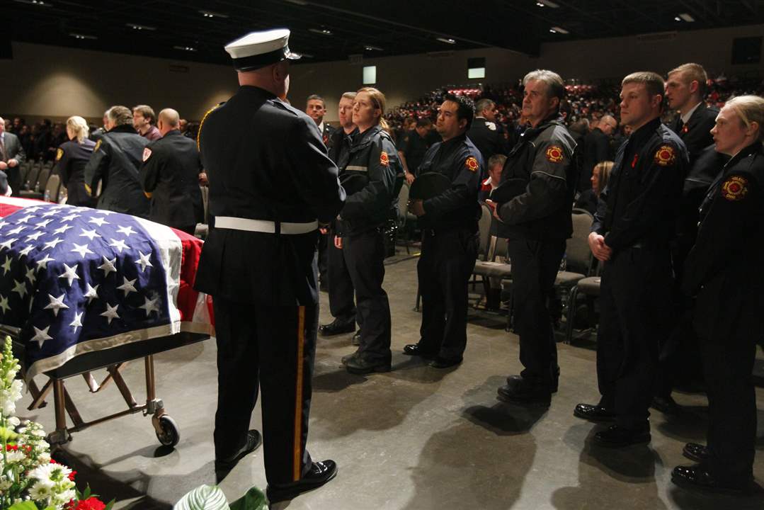 Toledo firefighters pause before the casket of firefighter James Dickman.