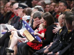 Paige Dickman, 3, daughter of Toledo firefighter James Dickman, holds an Ohio flag while sitting on the lap of her mother Jamie, wife of Mr. Dickman.
