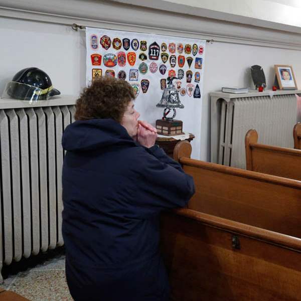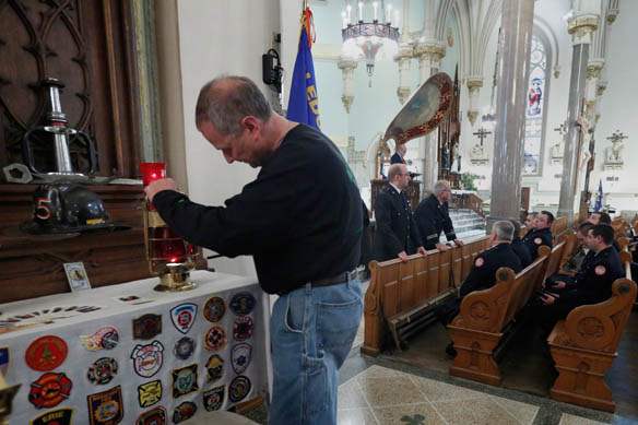 Retired firefighter Dave Meegan lights candles at the firefighter altar shrine before mass to celebrate the lives of Toledo firefighters Stephen A. Machcinski and James Dickman.