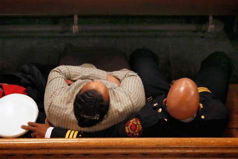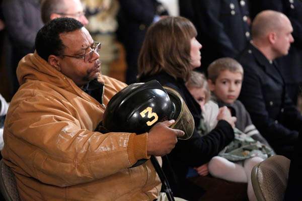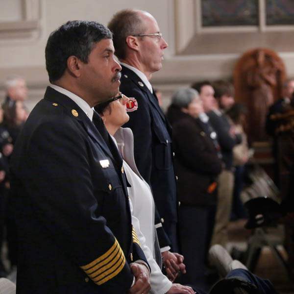 Toledo Fire Chief Luis Santiago attends mass to honor the lives of Toledo firefighters Stephen A. Machcinski and James Dickman.