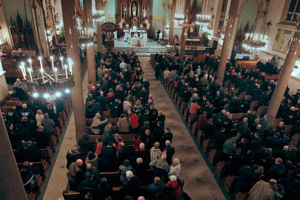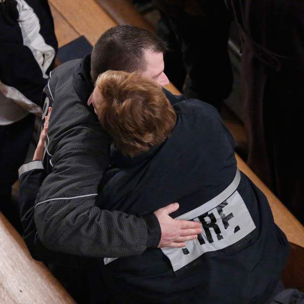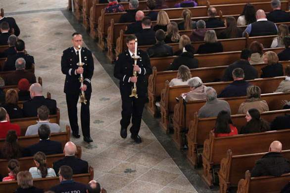 Firefighters walk down the aisle at the Historic Church of St. Patrick in Toledo.