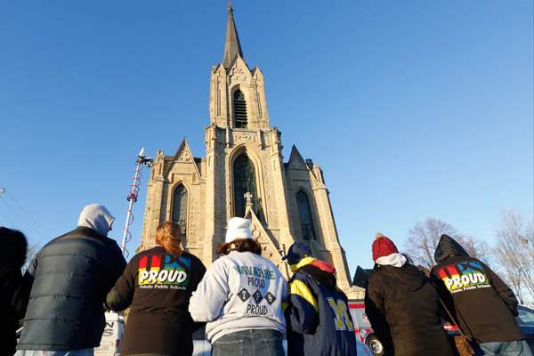 Toledo Public School teachers link arms as they stand outside to honor Toledo firefighters.