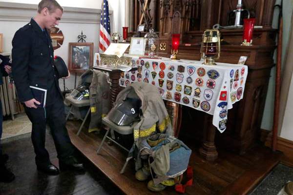 Bedford, Mich. firefighter Adam Horace walks past the firefighters altar shrine before the start of mass to celebrate the lives of Toledo firefighters Stephen A. Machcinski and James Dickman.