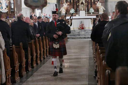 Washington Township Fire Chief Matt Hart plays Amazing Grace with his bagpipes during mass to honor the lives of Toledo firefighters Stephen A. Machcinski and James Dickman at the Historic Church of St. Patrick in Toledo. Hart will play at both of the firefighter's funerals, as well as tomorrow's Last Call event at Seagate. He is also a member of the Toledo Pipes & Drums.