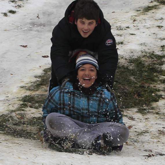 ROV sledding01p Sliding are, from front: Alayna (cq) Johnson, 11, Carly Neiswender, 11, [mostly obscured], and her brother Ryan Neiswender, 15, all of Toledo. Sledding down one of the hills in Ottawa Park in Toledo.