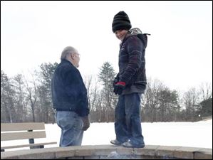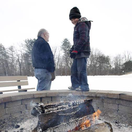 Craig Rehkopf, left, Maumee, and his grandson Austin Binkley, 8, Brandon, Mississippi, warm up by the fire while sledding at Sidecut Metropark Preserve.