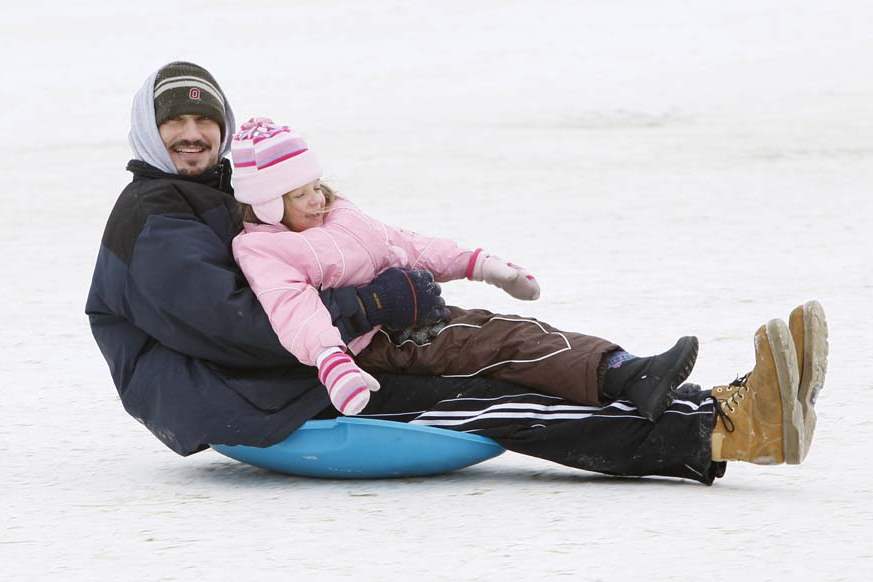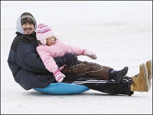 Jeff Shepler, Temperance, hangs on tight to his daughter Phoebe Shepler, 4, as they zoom down the sledding hill at Sidecut Metropark Preserve. The pair, along with Jeff's other daughter and Phoebe's sister Alison Shepler, were enjoying the holiday break.
