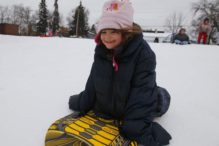 Olivia Hannum, 4, of South Toledo, center, flies down the hill while sledding with her sister and cousins at Harvard Elementary School in South Toledo. With temperatures hovering in the mid-twenties, a handful of sledders had taken to the hill, including Olivia, whose oversized coat and hat hid most of her face from the cold.